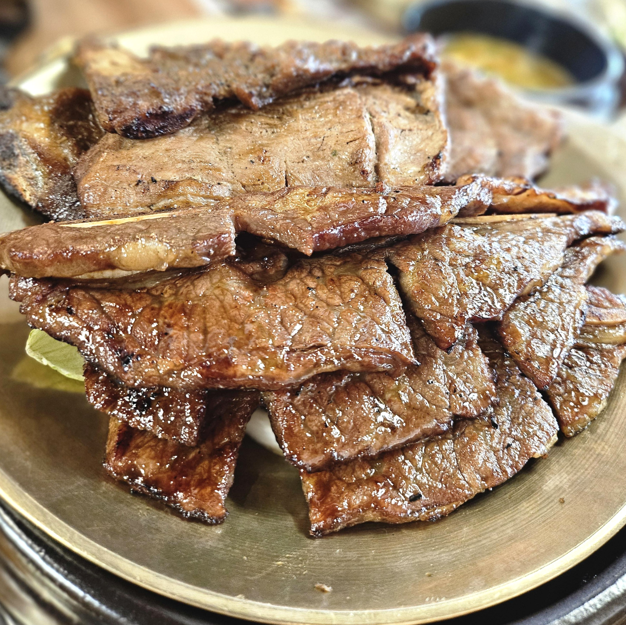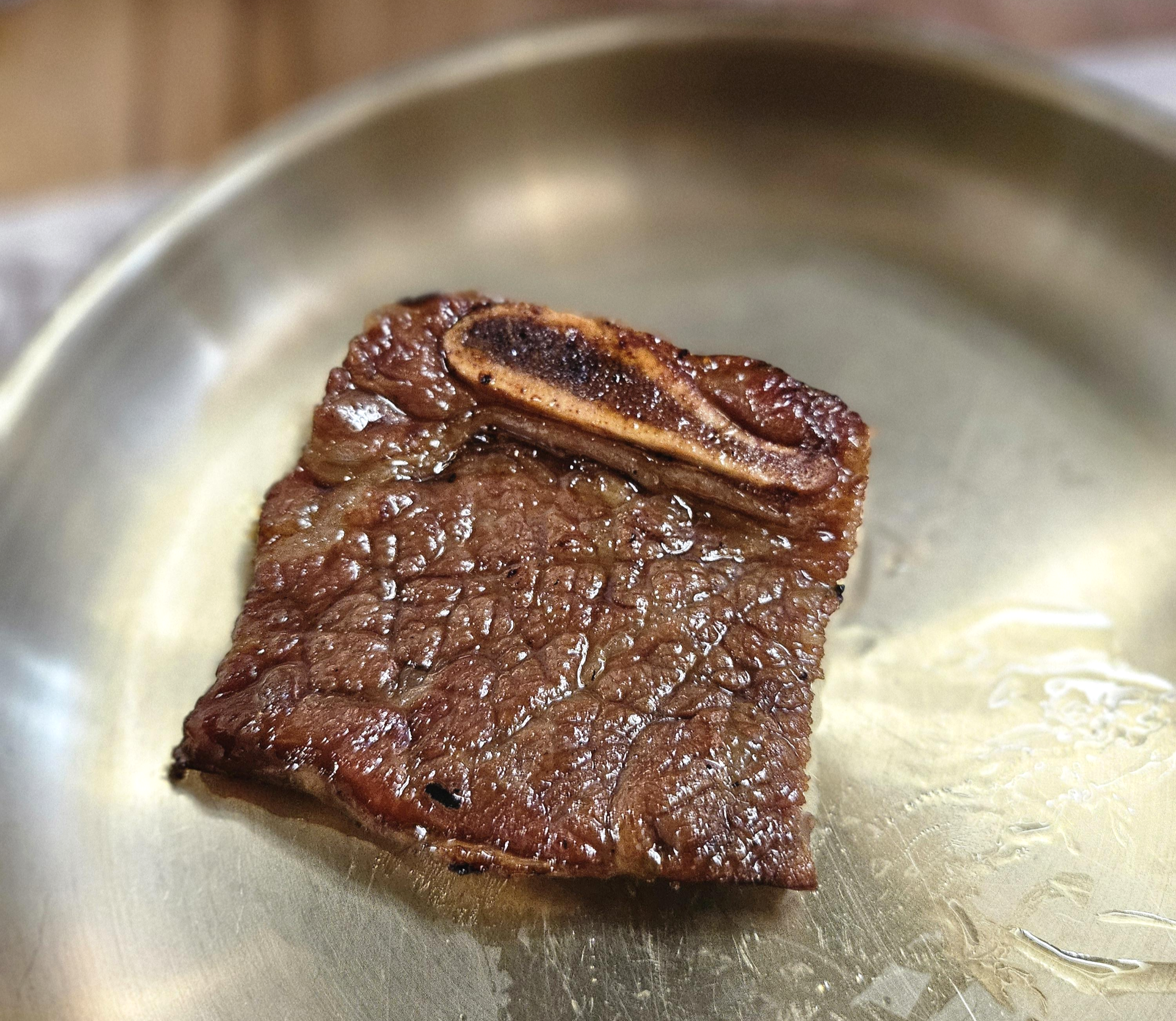 숯불에 잘 구워진 LA갈비가 나왔어요.