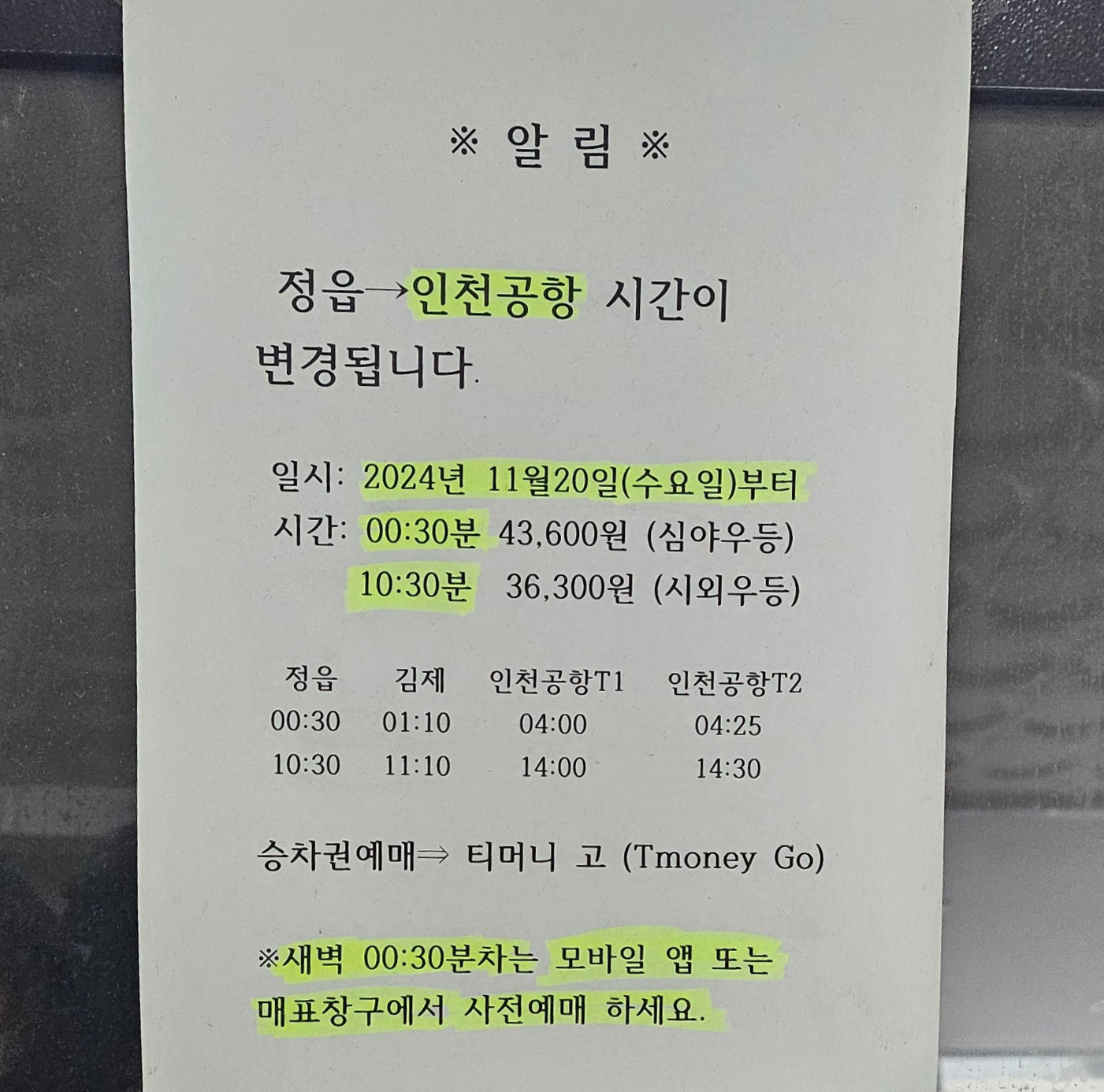 * 전주방면/ 익산, 대야, 군산/ 흥덕, 고창, 대산, 영광, 신광, 함평, 무안, 청계, 목포방면 운행 시간